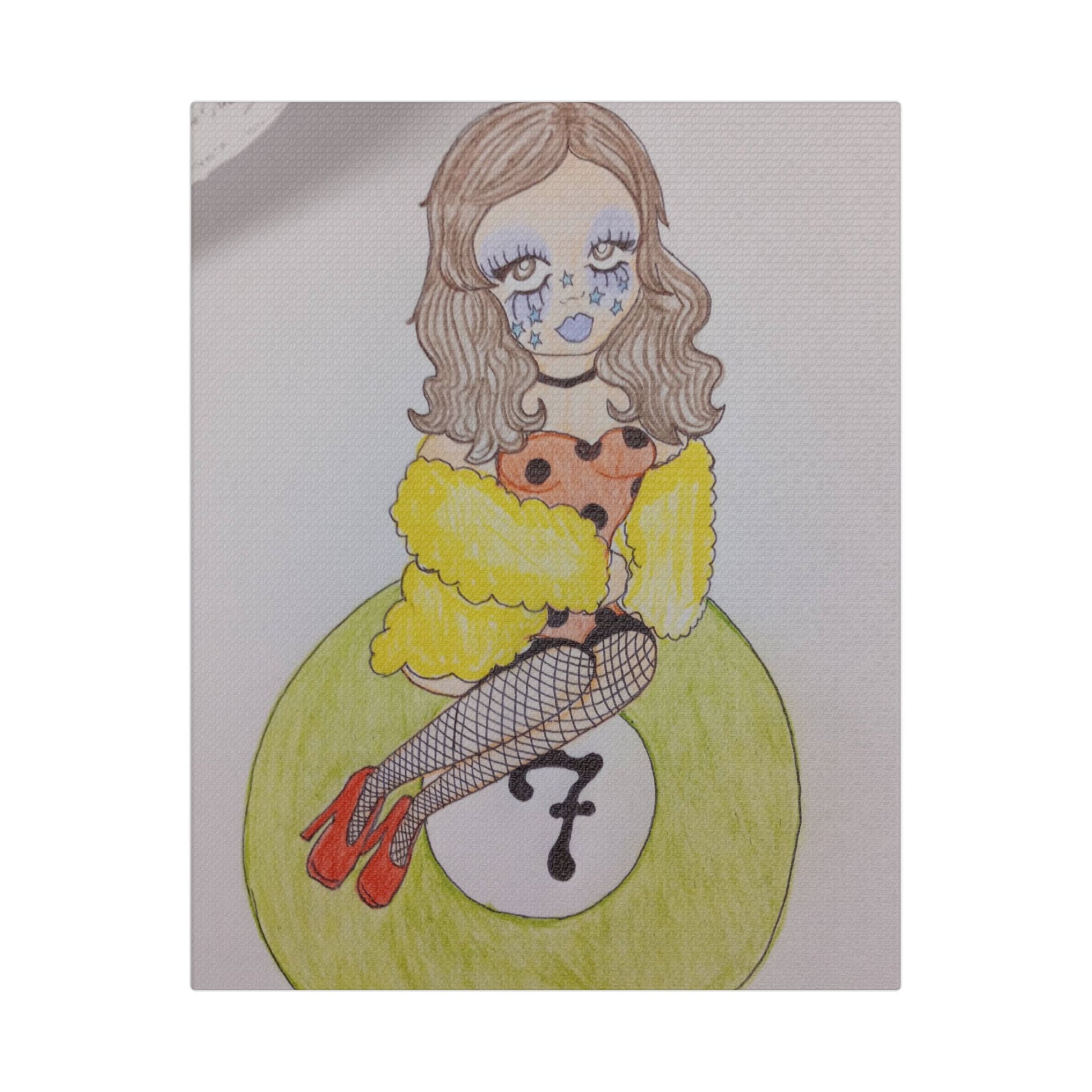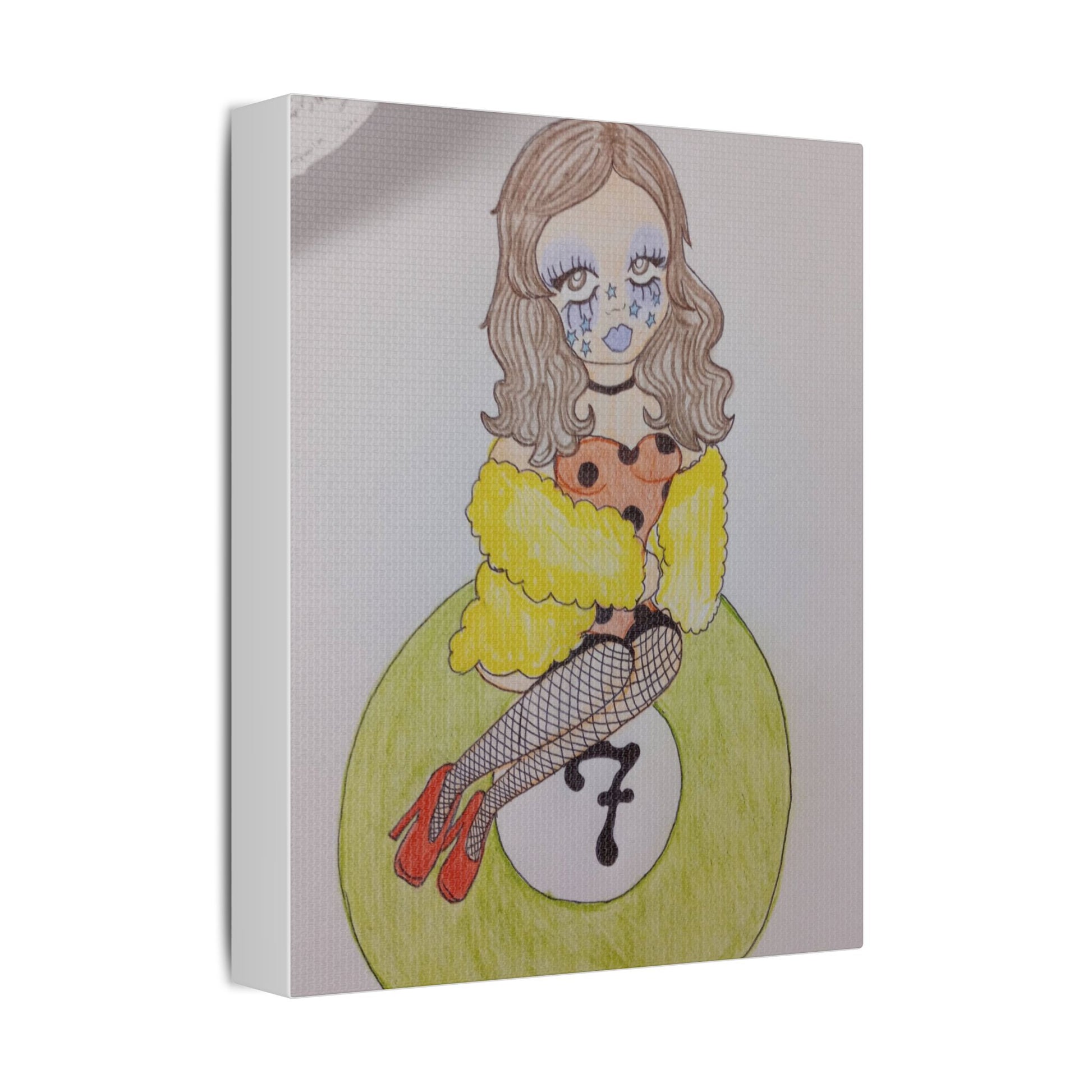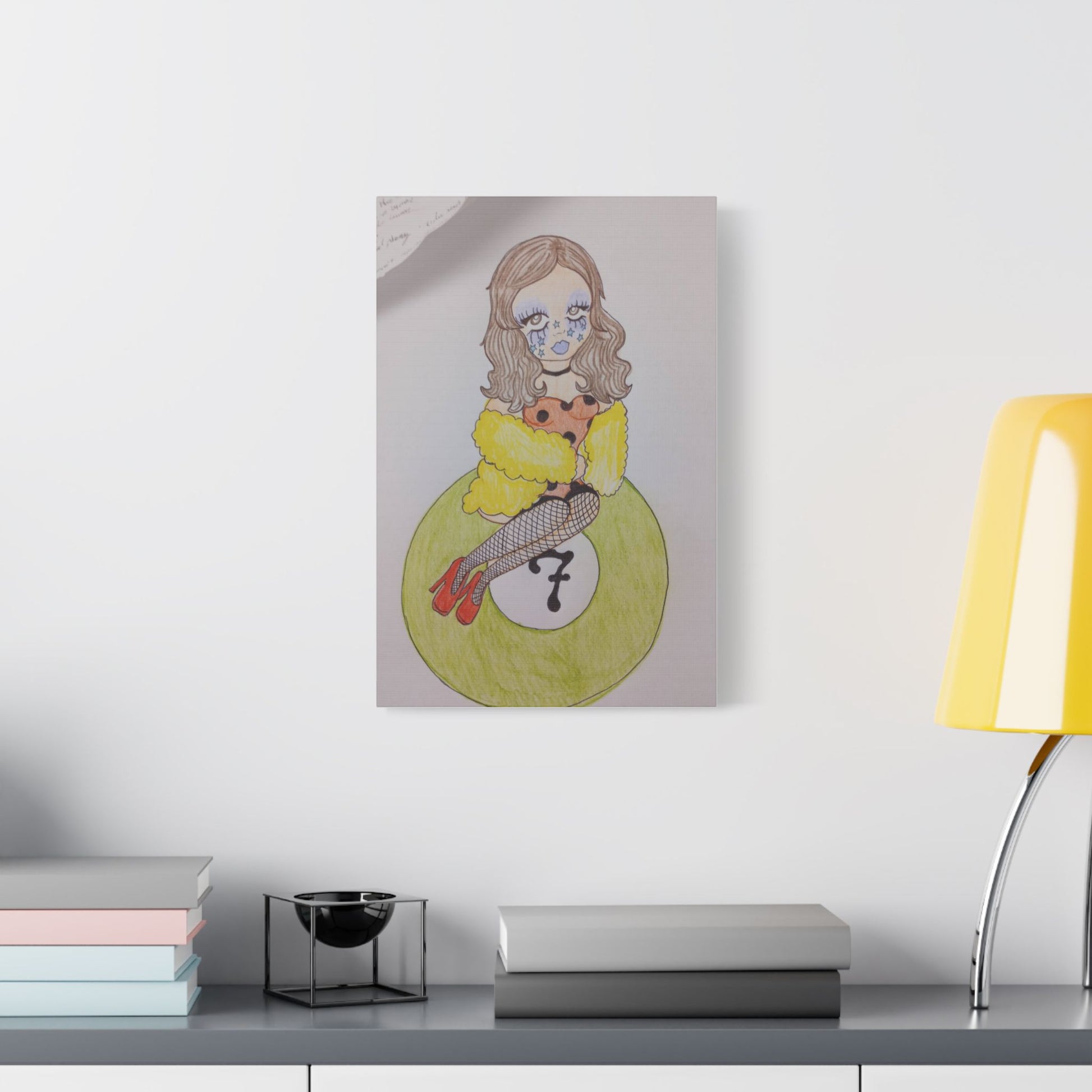 This stretched satin canvas brings a quirky, vintage-inspired illustration to life with bright, lasting color and a soft sheen. The artwork—featuring a wistful, doll-like figure in retro glam—feels both playful and slightly melancholic. Hung vertically or horizontally, the slim profile and metallic mounts keep the piece close to the wall, making it an intimate focal point in a cozy nook, studio, or gallery wall. The satin surface gives colors a subtle glow while protecting fine linework and pastel tones, so the personality of the original drawing remains clear for years.