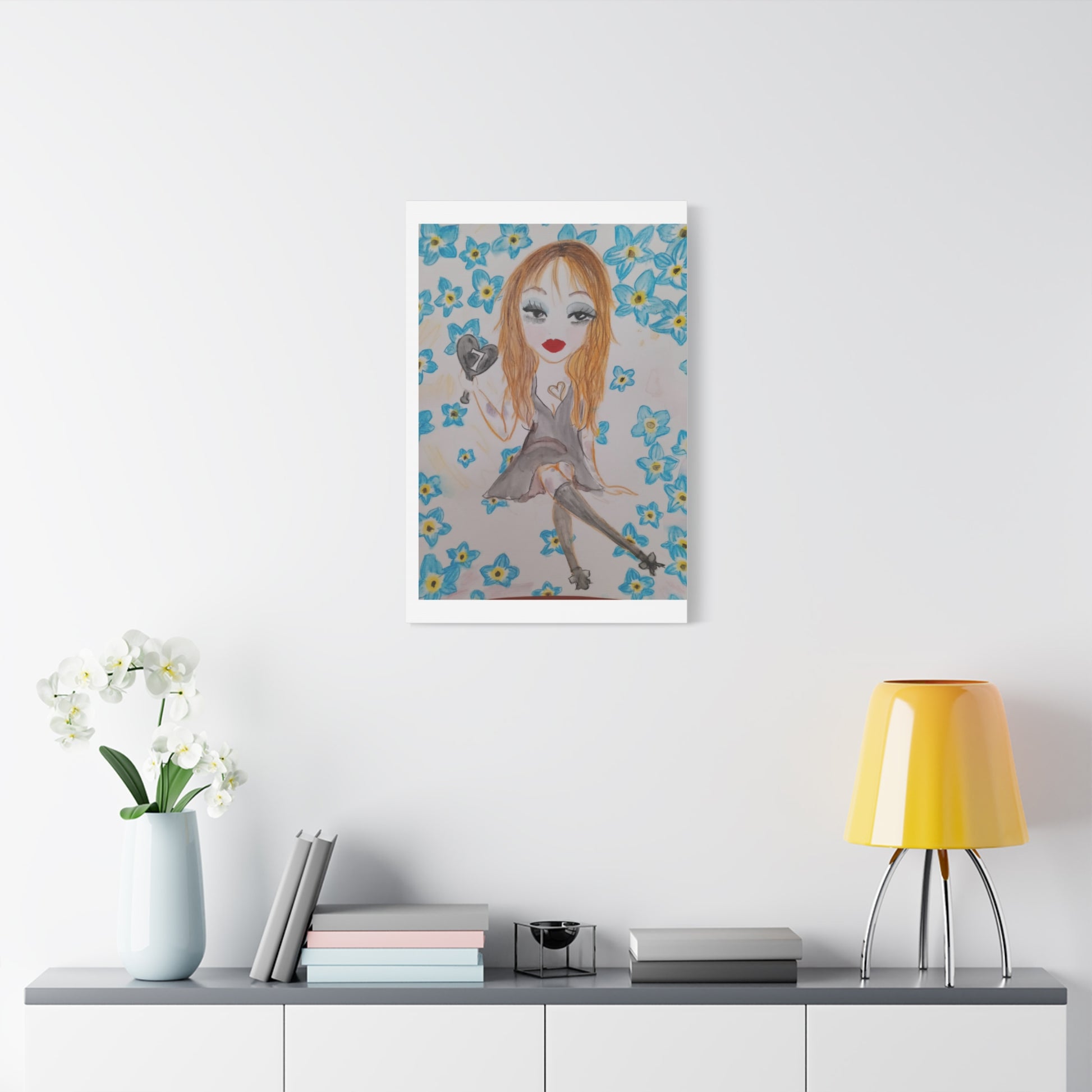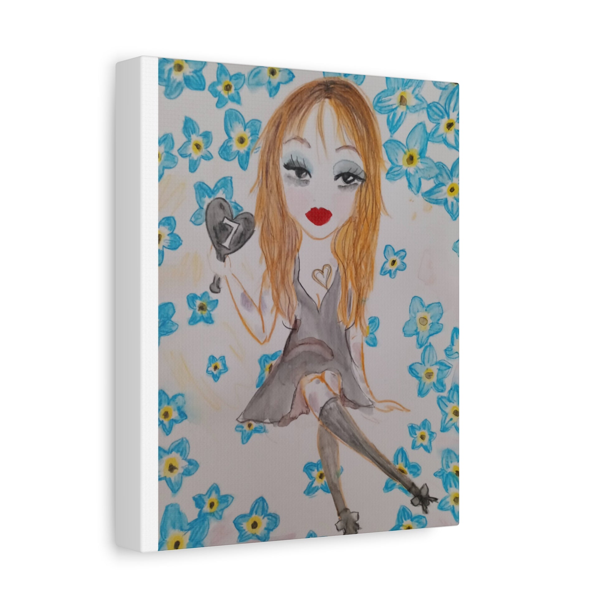 A dreamy matte canvas print that brings a hand-painted, whimsical portrait into any cozy corner. Soft watercolor textures, gentle blues, and a warm, golden-hued subject create a calm, intimate mood—like discovering a secret sketchbook page turned into art for the wall. The stretched 1.25" profile gives it a gallery-ready presence without overpowering a room. It hangs quietly on living room, bedroom, or studio walls and blends with bohemian, cottage, and vintage-inspired decor. The overall vibe is personal and gentle: a little playful, slightly mysterious, and quietly stylish.